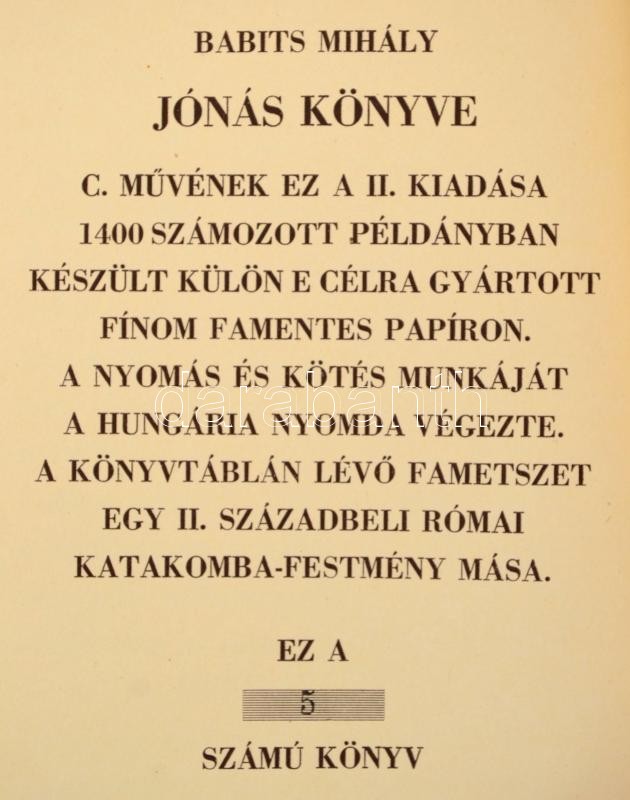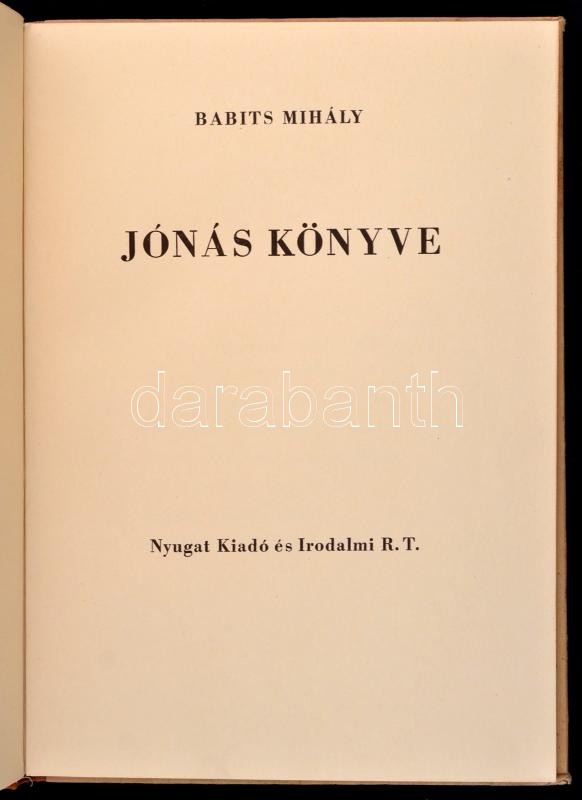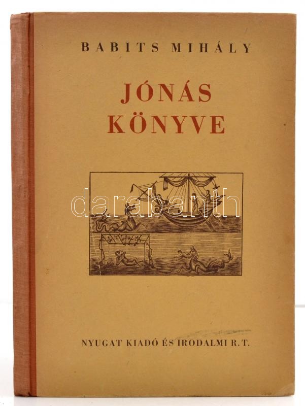 Babits Mihály: Jónás könyve. Bp.,(1941), Nyugat Kiadó és Irodalmi Rt., 20 sztl. lev. Második kiadás. Kiadói félvászon-kötés, jó állapotban. Számozott (1400/5.) példány.