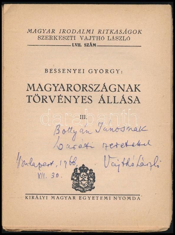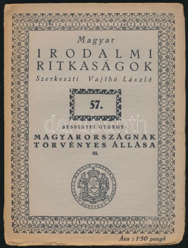 Bessenyei György: Magyarországnak törvényes állása. III. Magyar Irodalmi Ritkaságok 57. sz. Bp.,(1941), Királyi Magyar Egyetemi Nyomda. Kiadói papírkötés, felvágatlan példány.