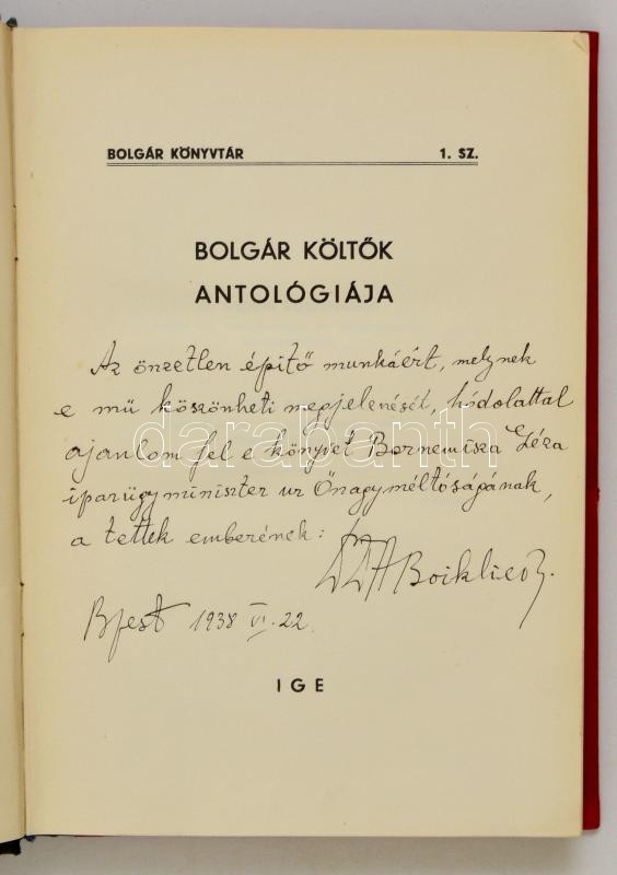 Bolgár költők antológiája. Fordította és összeállította: Dimo A. Boikliev. Bp.,(1938), Irók Gazdasági Egyesülete,(Merkantil-nyomda (Havas Ödön-ny.), 240 p. Kiadói aranyozott félvászon-kötés. Első kiadás. A fordító, Dimo A. Boikliev (1903-1992) műfordító, tolmács, egyetemi tanár dedikációjával Bornemisza Géza (1895-1983) a Gömbös-,Darányi-, Imrédy-, Kállay-kormányok kereskedelmi, iparügyi, valamint kereskedelem- és közlekedésügyi miniszterének részére.