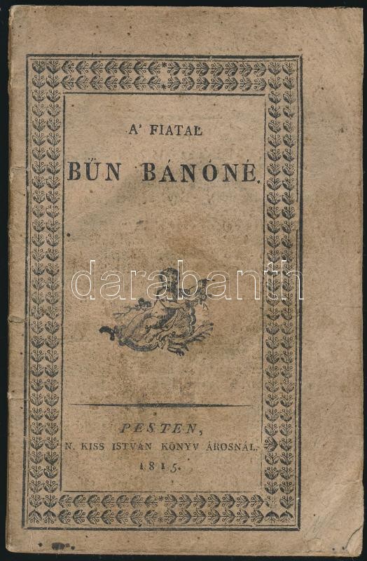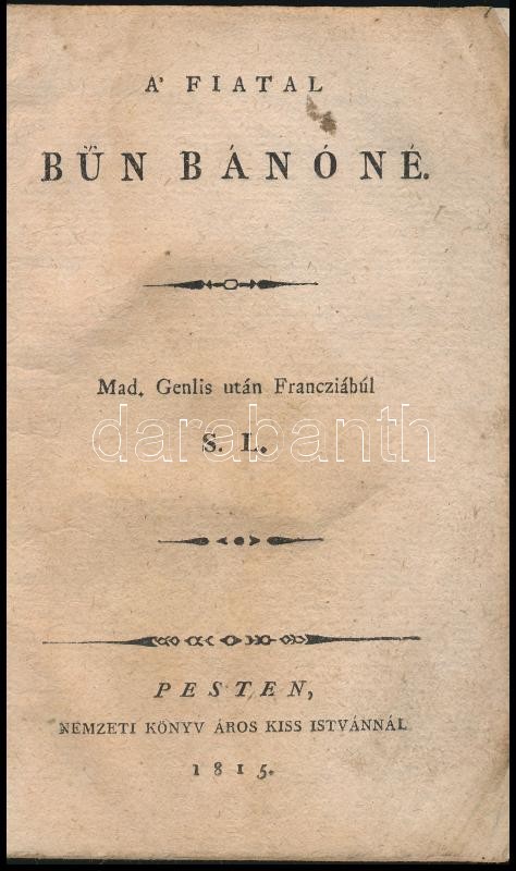 [Félicité de]Genlis (1746-1830): A fiatal bűn bánóné. Mad. Genlis után francziából S. L. Pest, 1815, "Nemzeti Könyvárus" Kiss István, 59 p. Kiadói papírkötés, kissé foltos, a lapok sarkaiknál gyűröttek.