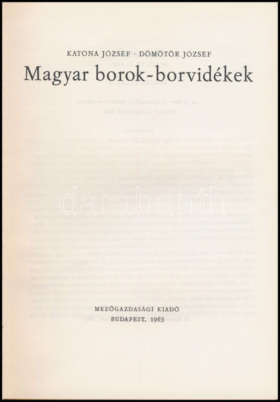 Katona József-Dömötör József: Magyar borok-borvidékek. Bp.,1963, Mezőgazdasági Kiadó. Kiadói egészvászon-kötés, kiadói kissé viseltes papír védőborítóban. A szerzők által, Kiss Ervin (1935-2009) szőlész kutató és nemesítő, a badacsonyi Szőlészeti és Borászati Kutatóintézet vezető kutatója, majd vezetőjének dedikálva, dátumozva, hely megjelöléssel (Badacsonyban). Katona József (1922-2013) borász, szakíró, később az Országos Szőlészeti és Borászati Kutató Intézet főigazgatója, főiskolai tanár. Dömötör József (1923-1977) borász, szakíró, Szőlészeti Kutató Intézet kísérleti gazdaságának főkönyvelője (1961-ig), majd a Borgazdasági Vállalatok Trösztjének vezérigazgatója (1971-1977), többek között a Márka üdítőital család kifejlesztése fűződik működéséhez.