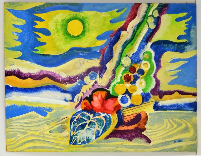 Leírás: Bakallár József (1940): Virág és nap. Olaj, farost, jelzett, 60×80 cm