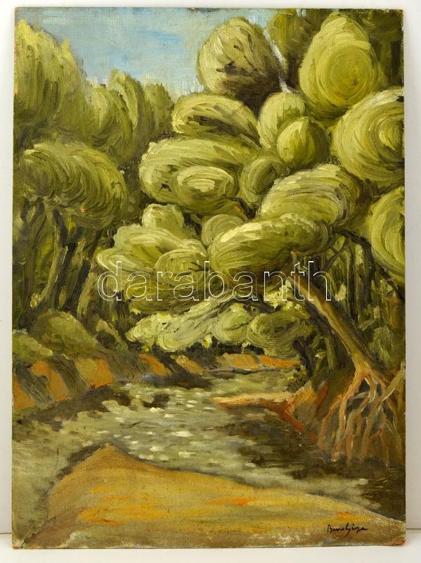 Leírás: Bene jelzéssel: Kiszáradt meder. Olaj, farost, 70×49 cm
