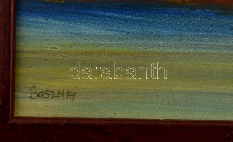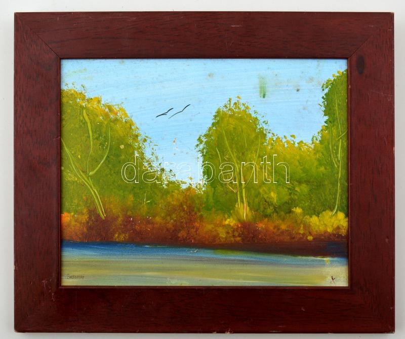 Leírás: Bosznai jelzéssel: Tóparton, olaj, farost, keretben, 19×24 cm