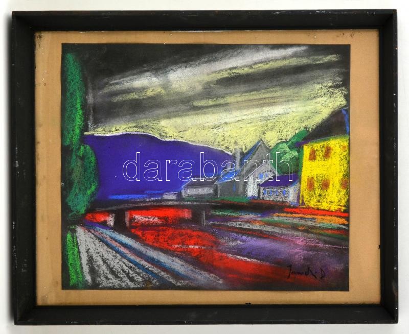 Leírás: Diener jelzéssel:Sárga ház a folyónál. pasztell, papír, üvegezett kereteben, 38×40 cm