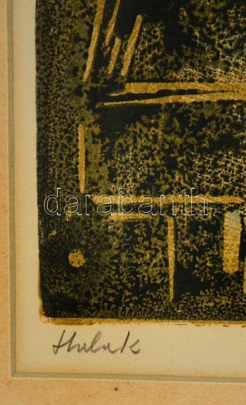 Leírás: Hegyi György (1922 - 2002): Halak. Színezett linó, papír, jelzett, üvegezett keretben, 24×30 cm
