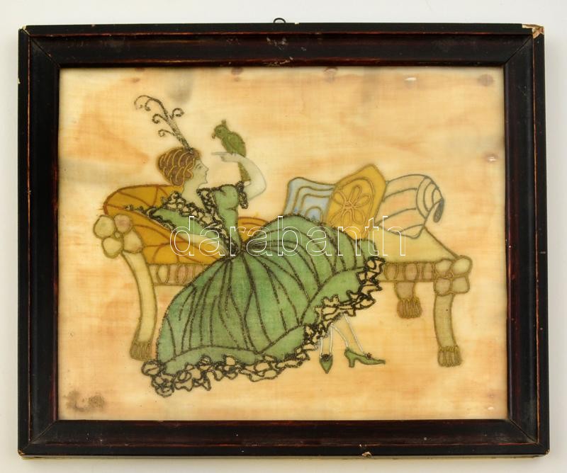 Leírás: Jelzés nélkül: Hölgy papagájjal. Festett selyemkép. Foltos, lyukas, üvegezett fa keretben, 21x25,5 cm