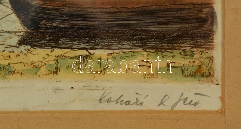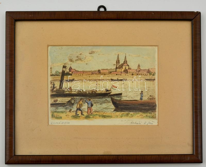 Leírás: Kohári K. Jenő (?-?): Komárom, színezett rézkarc, papír, jelzett, paszpartuban, üvegezett fa keretben, hátoldalon pecséttel jelzett, 16×21 cm