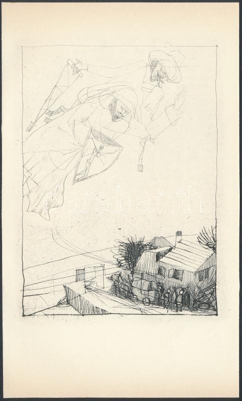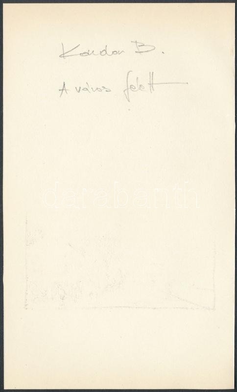 Leírás: Kondor Béla (1931-1972): A város felett, rézkarc, papír, jelzés nélkül, hátoldalon feliratozva, 11,5×8,5 cm