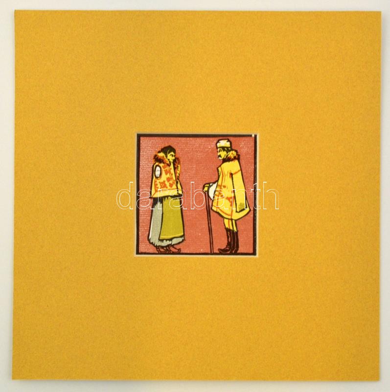 Leírás: Kós Károly (1883-1977): Székely házaspár. Színes linómetszet, papír, jelzés nélkül, paszpartuban, 10×10 cm