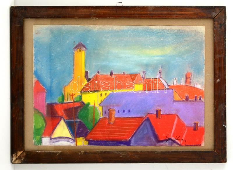 Leírás: Sváby jelzéssel: Háztetők. Pasztell, papír, üvegezett keretben, 29×42 cm