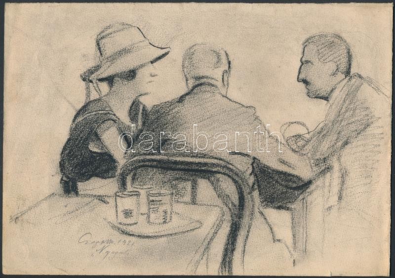 Leírás: Sz. Csapó Márton (1889-?): Kávéházi társaság, 1921, szén, papír, 20x26 cm.