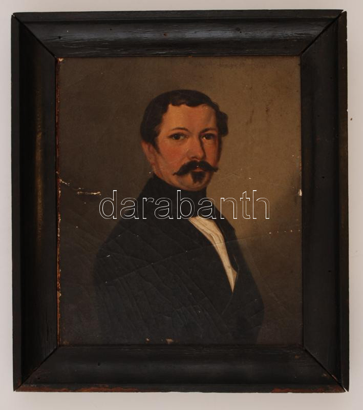 cca 1860 Jelzés nélkül: Férfi porté. Olaj, fatábla, sérült, hátoldalán felirattal "Hammer Károly Marosvásárhely első könyv és papír üzlet alapítója", 20×16 cm