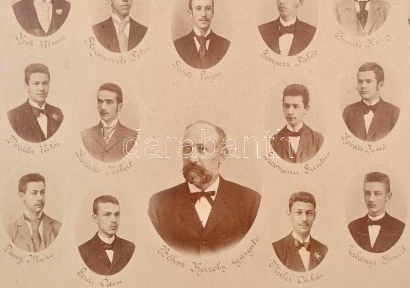 Leírás: 1895 Budapest, Evangélikus Főgimnázium tanárai és végzős diákjai, kistabló 32 nevesített portréval, 20x26 cm, karton 24x30 cm