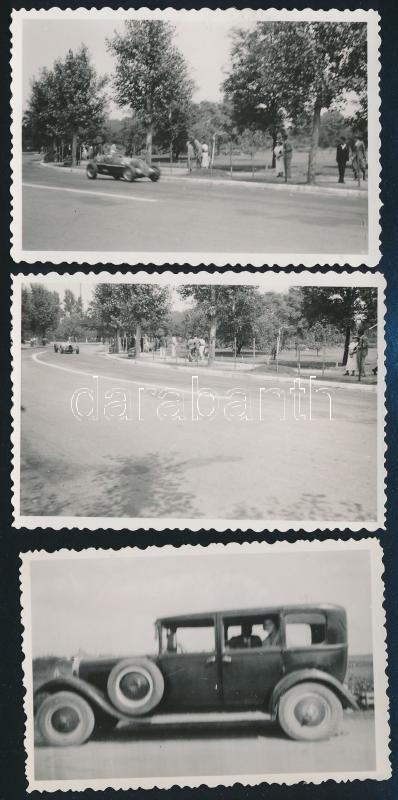 Leírás: 1935-1936 Autóverseny képei, 3 db, borítékban, a borítékon 1936-os évszám, az egyik fotón hátoldalán felirattal, 8x5 cm.