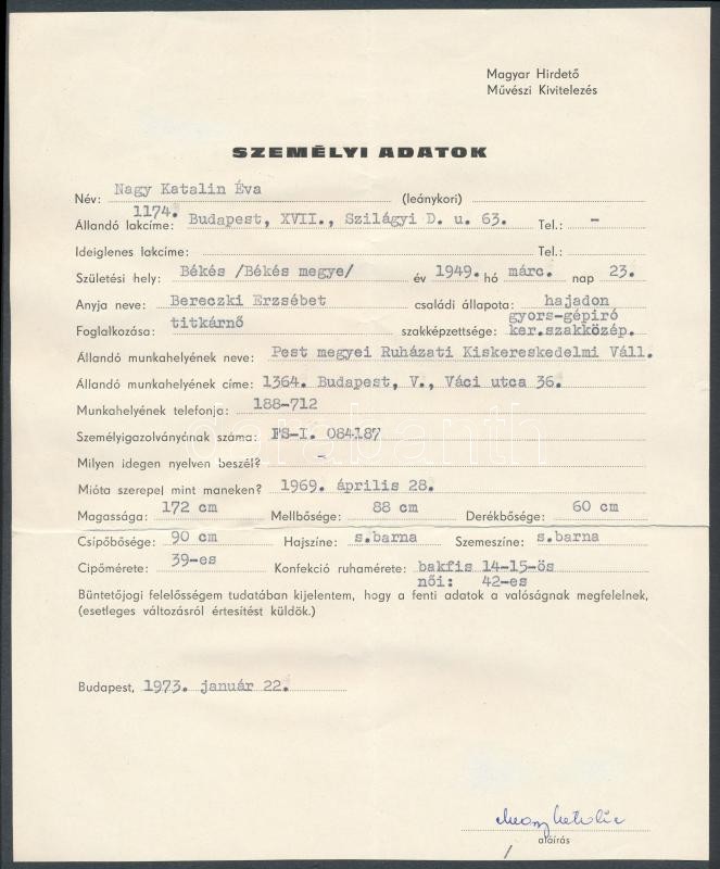 Leírás: 1972 Egy lap a manöken nyilvántartásból, 24x15,5 cm, karton 28,5x20 cm