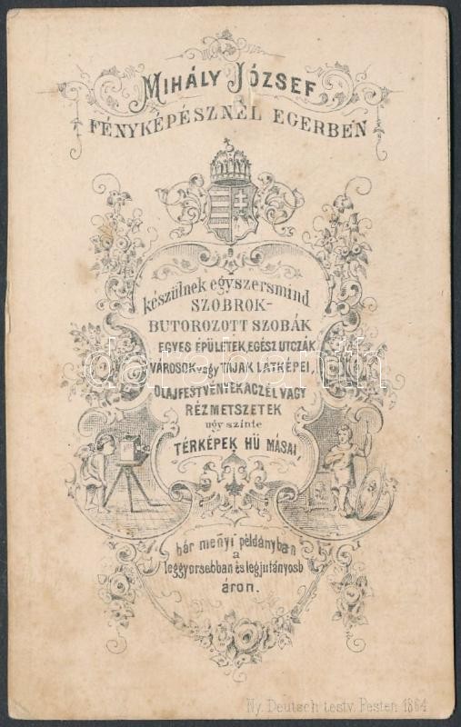 cca 1864 Mihály József fényképész egri műtermében készült, vizitkártya... https://www.darabanth.com/hu/290-Gyorsarveres/290.0/Festmeny-mutargy-papirregiseg-egyeb/Foto~100020/cca-1864-Mihaly-Jozsef-fenykepesz-egri-mutermeben-keszult-vizitkartya-meretu-fenykep-~II1530042