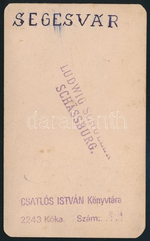Leírás: cca 1870-1890 Segesvári óratorony, keményhátú fotó, Ludwig Schuller segesvári műterméből, hátoldalán pecséttel feliratozva, könyvtári bejegyzéssel,10x6 cm./