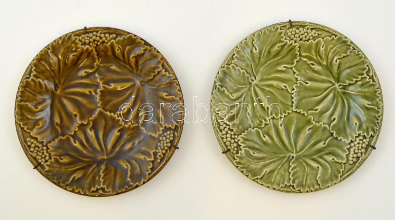 Leírás: 2 db szőlőmintás mázas kerámia fali dísztányér, jelzés nélkül, d: 21 cm