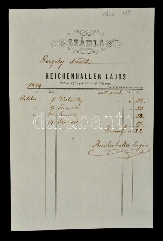 1859 Vác, Reichenhaller Lajos gyógyszertára számla https://www.darabanth.com/hu/290-Gyorsarveres/290.0/Festmeny-mutargy-papirregiseg-egyeb/Okmanyok~100017/1859-Vac-Reichenhaller-Lajos-gyogyszertara-szamla~II1521990