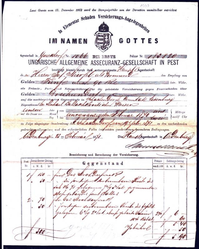 1871 A Pesti Általános Biztosító Társaság kötvénye / Insurance bond https://www.darabanth.com/hu/290-Gyorsarveres/290.0/Festmeny-mutargy-papirregiseg-egyeb/Okmanyok~100017/1871-A-Pesti-Altalanos-Biztosito-Tarsasag-kotvenye-Insurance-bond~II1499023