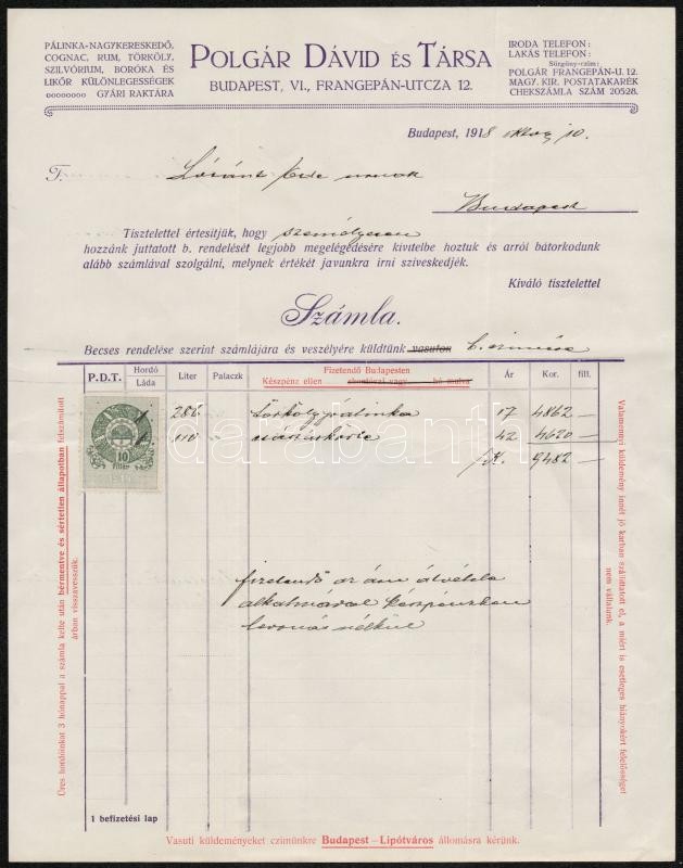 Leírás: 1918 Polgár Dávid és Társa számla 10f okmánybélyeggel