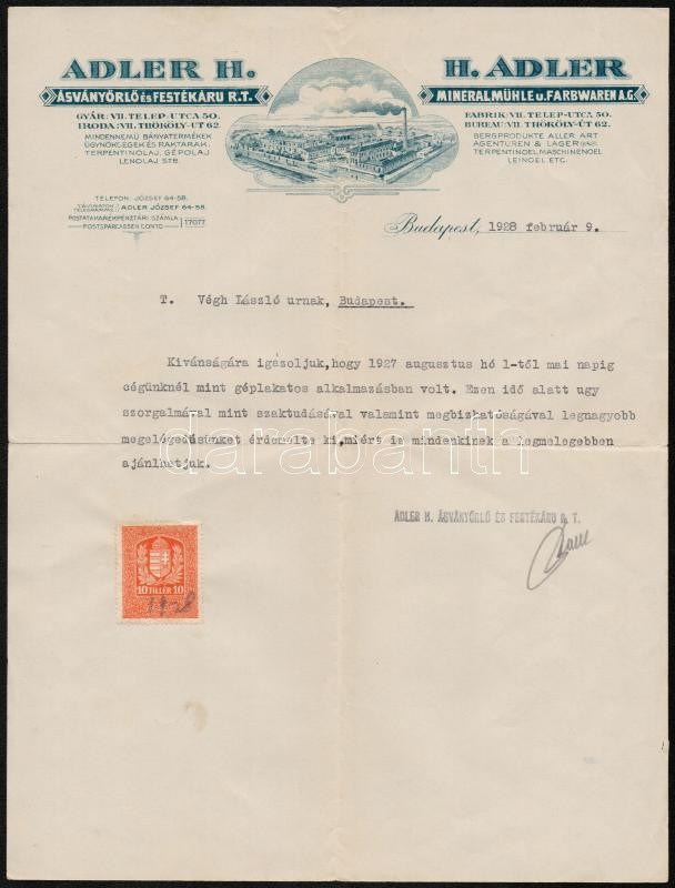 Leírás: 1928 Adler H. Ásványörlő és Festékáru Rt. igazolása, díszes fejléces levélpapírpn, 10 filléres illetékbélyeggel, pecséttel, aláírással.