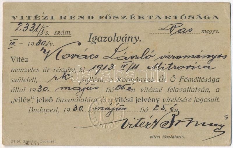 Leírás: 1930 Vitézi Rend igazolása 'vitéz' jelző használatára és vitézi jelvény viselésére, vitézi főszéktartó aláírásával, 7,5x12 cm