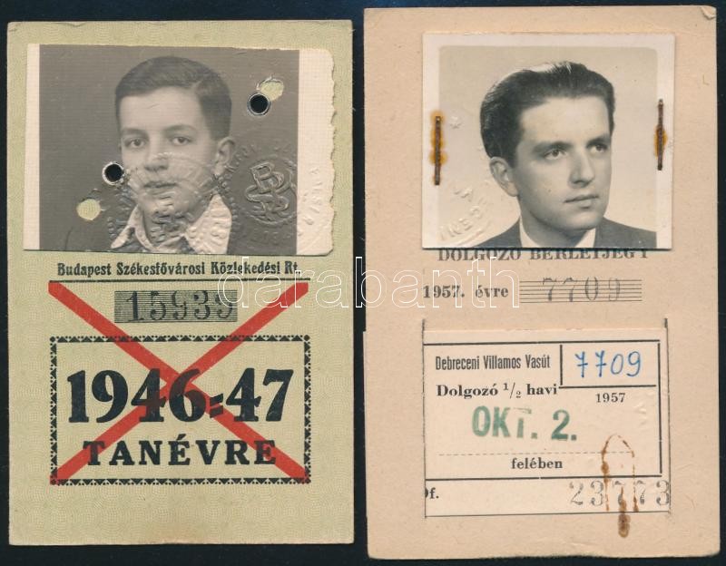 Leírás: 1946, 1957 A Debreceni Villamos Vasút és a Budapest Székesfővárosi Közlekedési Rt. tanuló és felnőtt bérletjegye