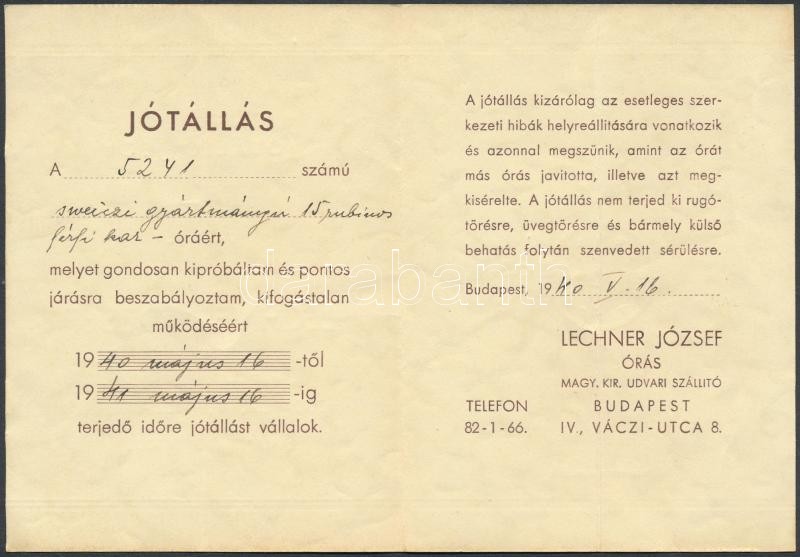 cca 1940 Lechner József órás jótállási jegye svájci órára, https://www.darabanth.com/hu/290-Gyorsarveres/290.0/Festmeny-mutargy-papirregiseg-egyeb/Okmanyok~100017/cca-1940-Lechner-Jozsef-oras-jotallasi-jegye-svajci-orara-~II1532981