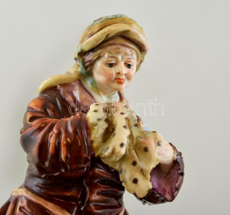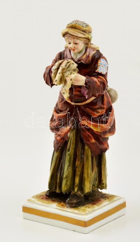 Capodimonte koldus asszony figura, kézzel festett, jelzett, apró lepattanásokkal, m: 18 cm / Capodimonte beggar figure, hand painted, signed, with minor faults