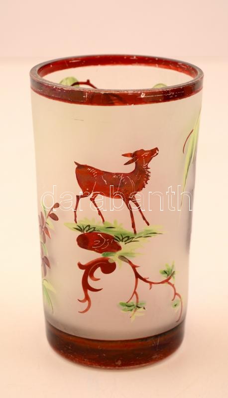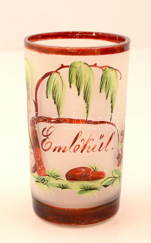 cca 1900 emlék pohár, magyar, hengeres színtelen üveg , tejüveg és rubinpác festéssel, koronás magyar címerrel "emlékűl" felirattal, kopott csorba nélkül, m:12 cm
