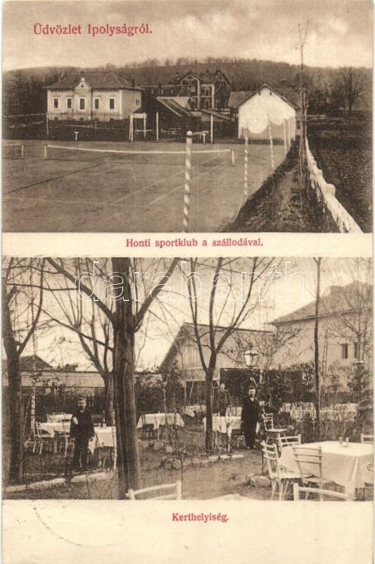 Leírás: Ipolyság, Sahy; Honti sportklub a szállodával, teniszpálya, kerthelyiség. Kiadja Wagner János / sport club with hotel, garden, tennis court (EK)
