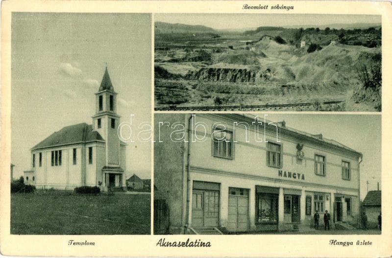 Leírás: Aknaszlatina, Slatinské Doly, Solotvyno; Beomlott sóbánya, templom, Hangya üzlet / church, cooperative shop, collapsed salt mine