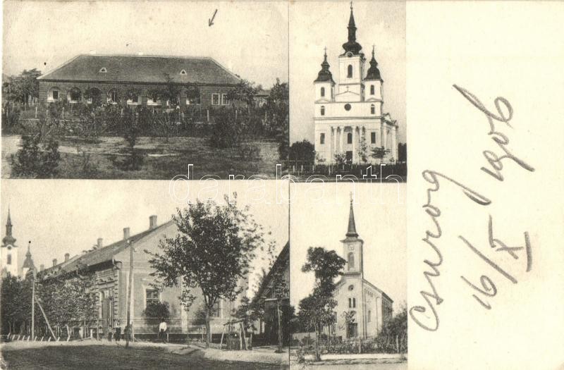 Leírás: Csurog, Curug; Községháza, szerb ortodox templom, katolikus templom / town hall, Serbian orthodox church, catholic church (EK)