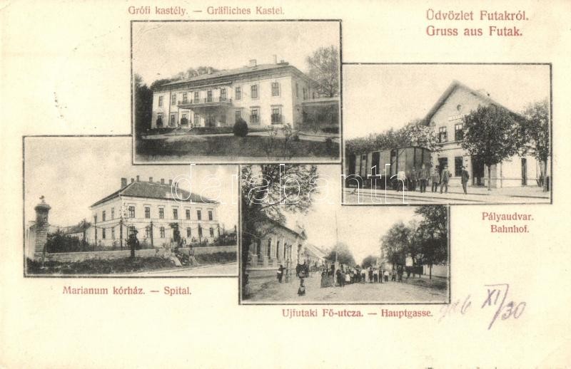 Leírás: Futak, Futog; Marianum kórház, Fő utca, vasútállomás vagonokkal, Hadik kastély. Singer József kiadása / hospital, main street, railway station, castle (EK)
