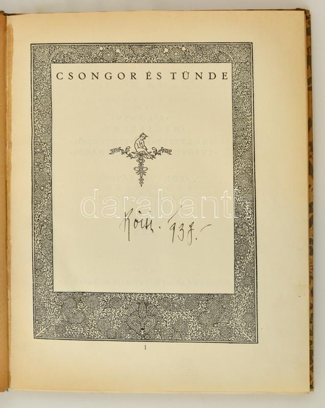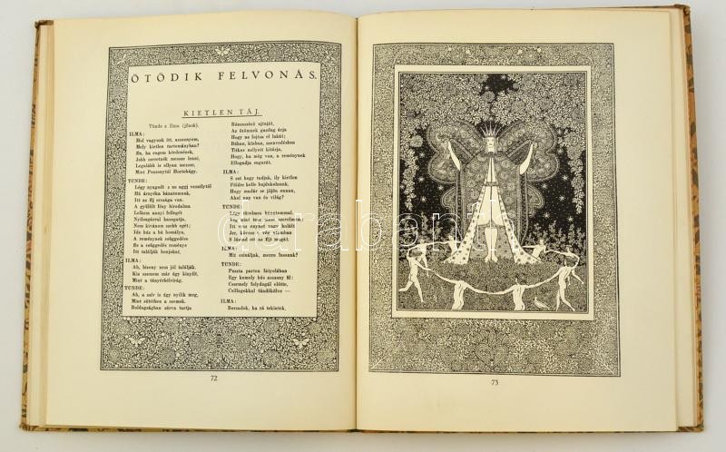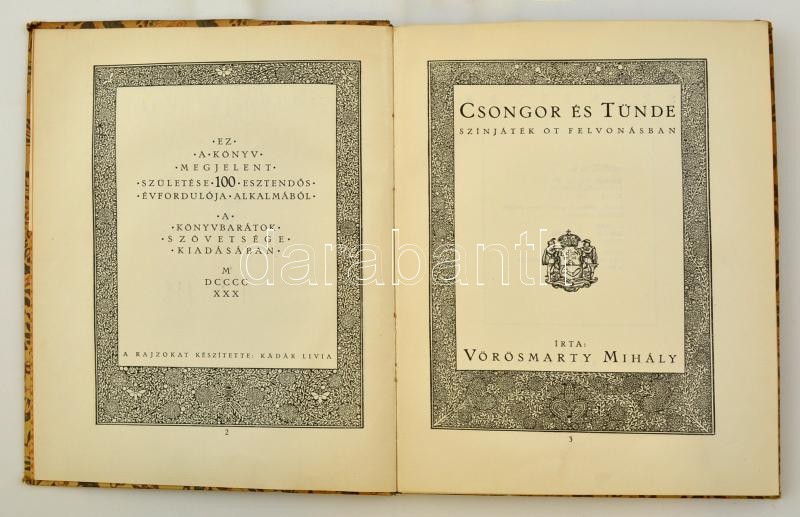 Vörösmarty Mihály: Csongor és Tünde. Budapest, 1930, Könyvbarátok Szövetsége, Királyi Magyar Egyetemi Nyomda. Megjelent Vörösmarty születésének 100 esztendős évfordulója alkalmából. Átkötött kissé kopottas kartonált papírkötés, kissé vettemedett elülső borítóval, 6-11. oldalak között kijáró lapokkal. Az öt, lapszámozáson belüli, egészoldalas rajzokat Kádár Lívia készítette. Bibliofil, keretdíszes lapokkal, külön erre a célra készült vízjegyes papíron (Diósgyőri Papírgyár), ex libris-szel.