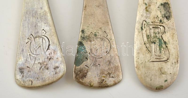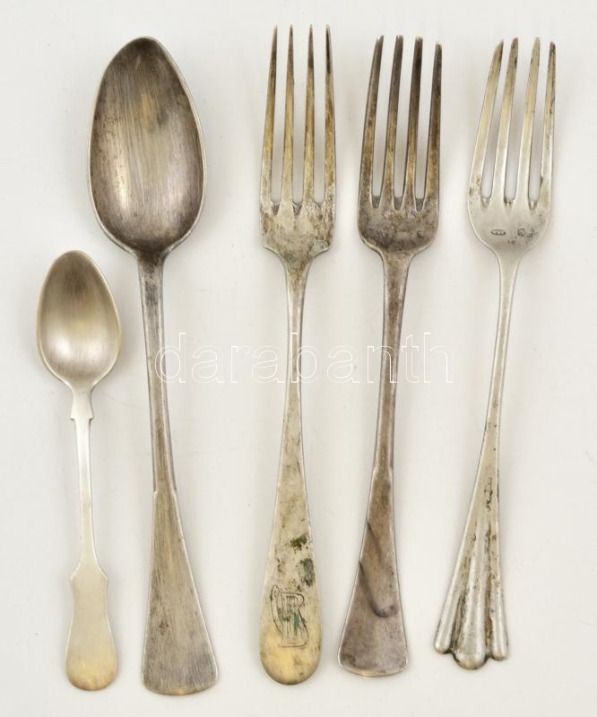 Leírás: Ezüst (Ag.) villák és kanál (4 db), kis kanál ezüstözött, Jelzettek nettó ( 4db): 154 g