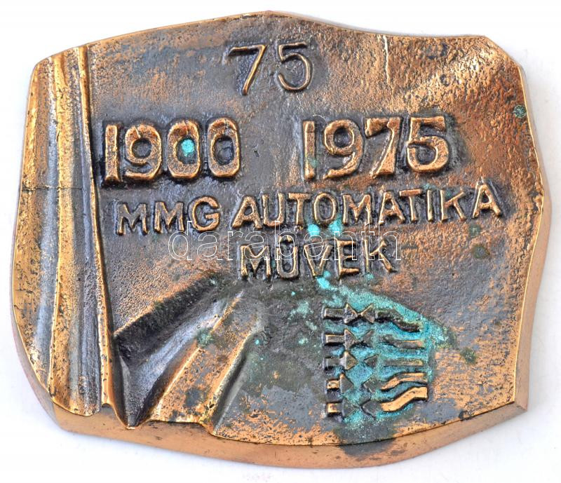 Leírás: 1975. "MMG (Mechanikai Mérőműszerek Gyára) Automatika Művek 75 éves" Br plakett (102x121mm) T:2 patina