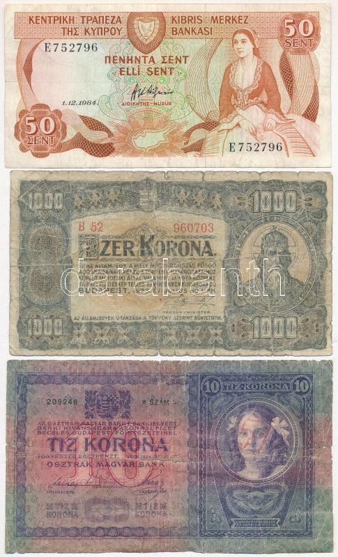 Vegyes: 9db-os bankjegy tétel, benne egy fénymásolt darab, közte 1902. 1000K mindkét oldal német, függőleges "DEUTSCHÖSTERREICH" bélyegzéssel, 1920, 1000K "Orell Füssli Zürich" nyomdahely jelöléssel, Orosz Birodalom 1918. 1000R T:vegyes