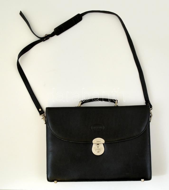 Leírás: Tergan fekete bőr aktatáska, kopásnyomokkal, vállpánttal, 41x28x5 cm