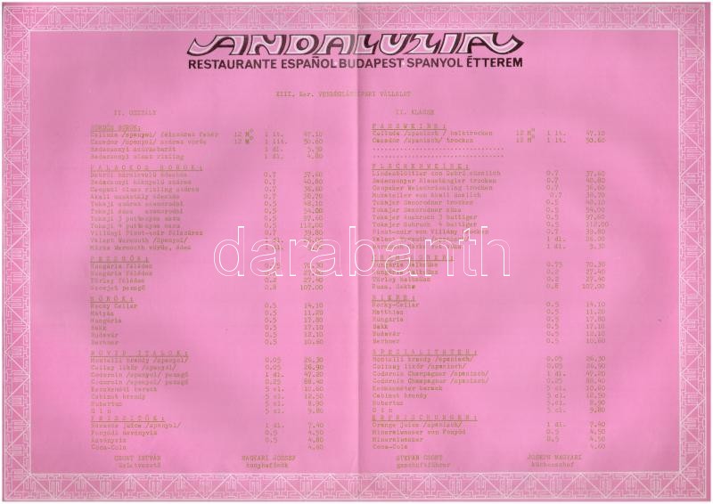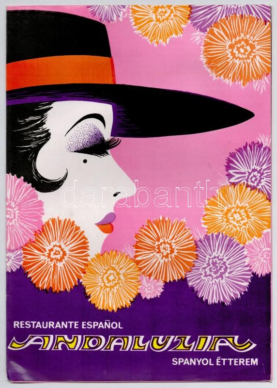 cca 1980 Andaluzia budapesti spanyol étterem étlapja, 29,5x21 cm https://www.darabanth.com/hu/291-Gyorsarveres/291.0/Festmeny-mutargy-papirregiseg-egyeb/Nyomtatvanyok~27/cca-1980-Andaluzia-budapesti-spanyol-etterem-etlapja-29-5x21-cm~II1539818