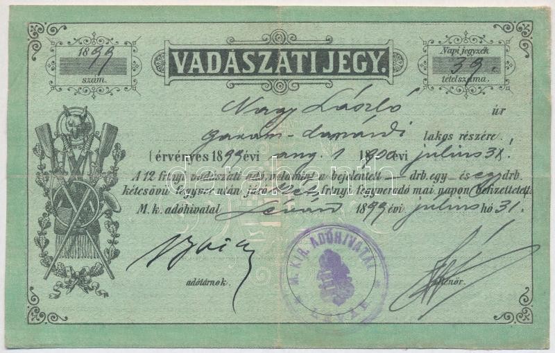1899 Vadászati jegy szép állapotban https://www.darabanth.com/hu/291-Gyorsarveres/291.0/Festmeny-mutargy-papirregiseg-egyeb/Okmanyok~18/1899-Vadaszati-jegy-szep-allapotban~II1540163