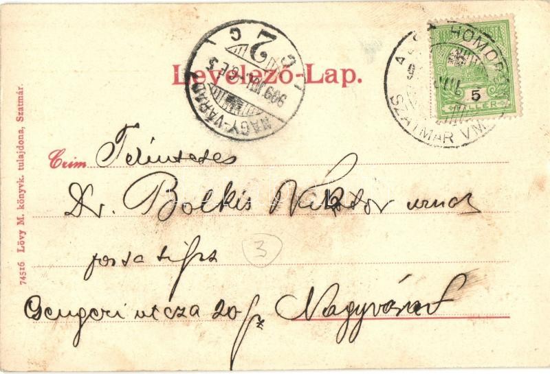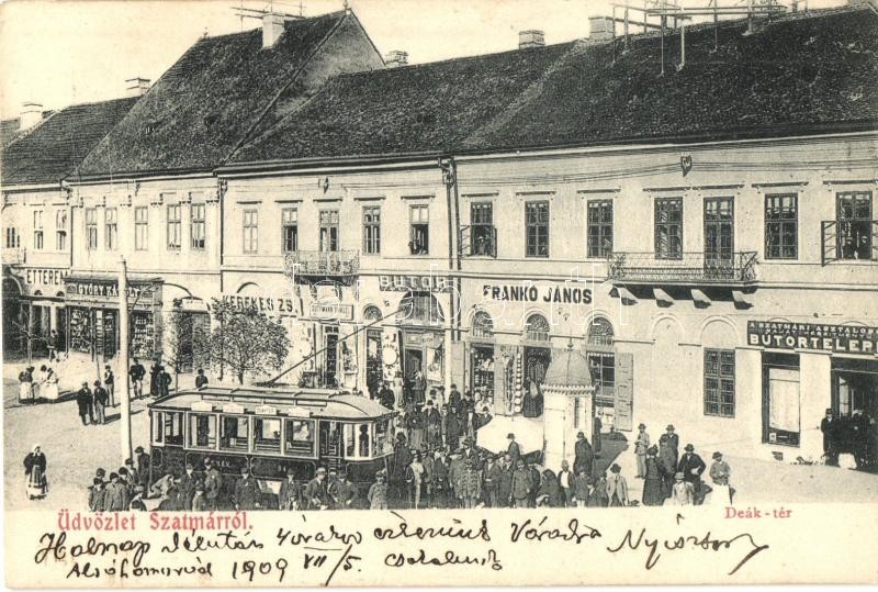 Szatmárnémeti, Szatmár, Satu Mare; Deák tér, villamos, étterem, Győry Károly, Kerekes Zs., Guttmann Sámuel, Frankó János üzletei, Szatmári asztalosok saját készítményű bútortelepe; Dr. Bolkis Viktor nagyváradi posta és távirdatisztnek címezve, Löwy M. kiadása / square, tram, restaurant, shops, carpenters association's furniture store (EK)