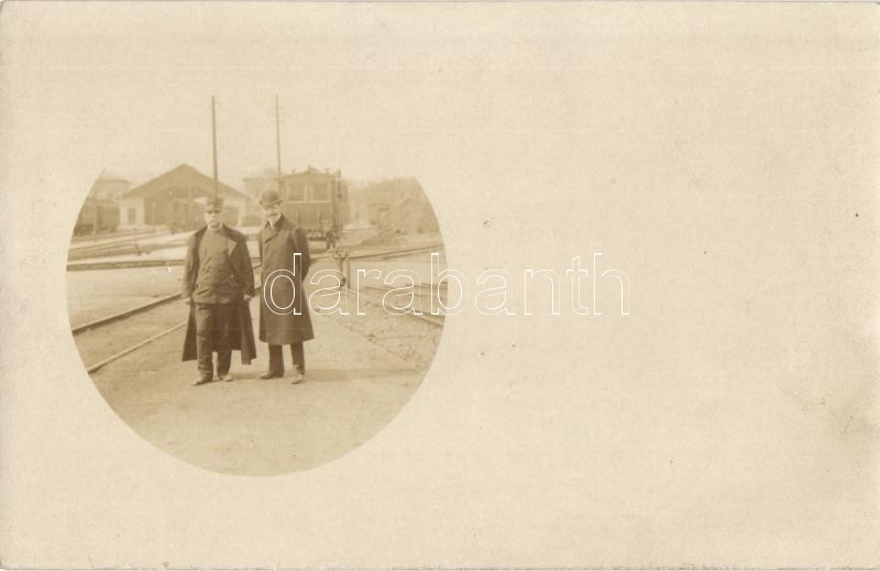 Leírás: ~1910 Nagykanizsa, vasútállomás vasutassal, photo
