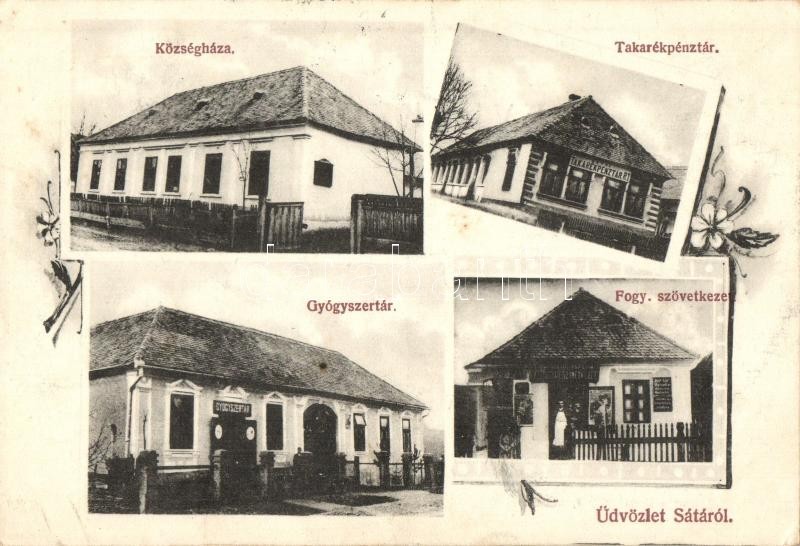 Leírás: Sáta, Községháza, gyógyszertár, takarékpénztár, fogyasztási szövetkezet, floral