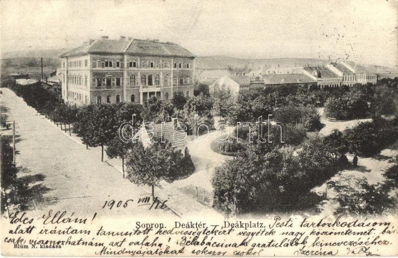 Sopron, Deák tér, park, Blum N. kiadása (EK) https://www.darabanth.com/hu/291-Gyorsarveres/291.0/Kepeslapok/Magyarorszag~400005/Sopron-Deak-ter-park-Blum-N-kiadasa-EK~II1536384