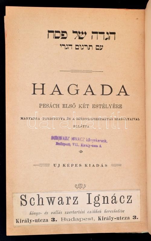Leírás: Hagada. Pesách első két estélyére. Magyarra fordította és a széder-szertartás szabályaival elláta Schwarz Ignác. Bp., é.n., Schwarz Ignác, 72 p. Javított gerincű illusztrált egészvászon-kötés, kopottas borítóval.