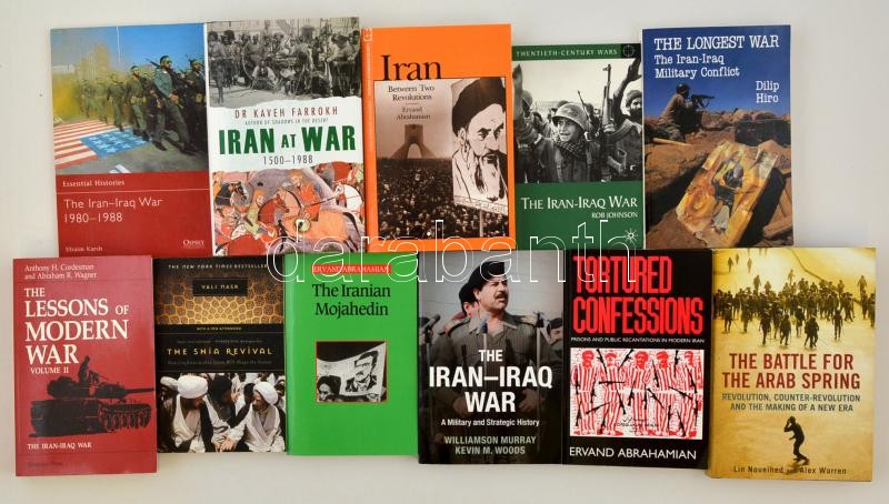 11 db nagyrészt iráni modern hadtörténeti könyv: Farrokh, Kaveh: Iran at War 1500-1988 (2011); Cordesman, Anthony - Wagner, Abraham: The Lessons of Modern War II.: The Iran-Iraq War (1991); Karsh, Efraim: The Iran-Iraq War 1980-1988 (2010); Murray, Williamson - Woods, Kevin M.: The Iran-Iraq War. A Military and Strategic History (2014); Abrahamian, Ervand: Iran Between Two Revolutions (1982); Abrahamian, Ervand: The Iranian Mojahedin (1989); Abrahamian, Ervand: Tortured Confessions (1999); Johnson, Rob: The Iran-Iraq War (2011); Noueihed, Lin - Warren, Alex: The Battle for the Arab Spring (2012); Nasr, Vali: The Shia Revival (2007); Hiro, Dilip: The Longest War. The Iran-Iraq Military Conflict (2008). Példányonként változó kötésben, jó állapotban.