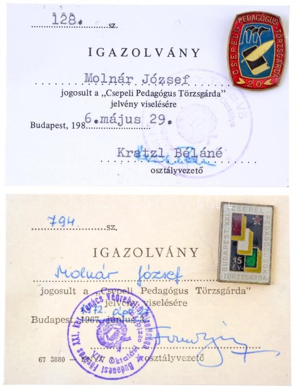 Leírás: 1972. "Budapest XXI. Csepel Pedagógusok Törzsgárda 15 év" zománcozott fém jelvény igazolvánnyal + 1986. "Csepeli Pedagógus Törzsgárda 20 év" zománcozott fém jelvény igazolvánnyal T:1-
